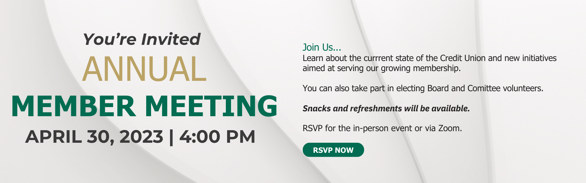 The Board of Directors will report on the current state of the Credit Union and new initiatives to better serve the growing membership base. Members will also elect volunteers to serve on the Board of Directors. Questions are welcomed at the end. All members are encouraged to attend.